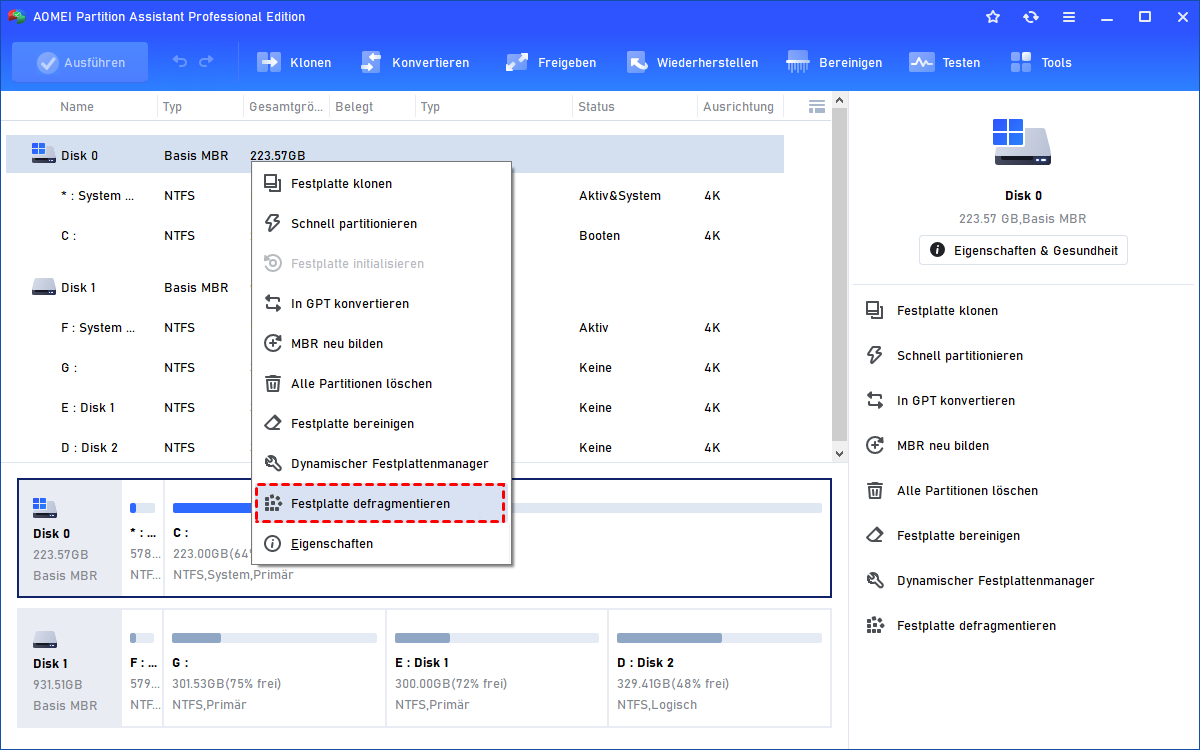 Schritt 1. Laden Sie die Software herunter, installieren Sie sie und starten Sie sie. Wählen Sie die gewünschte Festplatte aus. Klicken Sie im rechten Menü auf „Festplatte defragmentieren“.