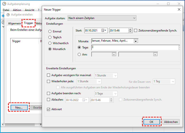 Schritt 4. Gehen Sie zum Tab „Trigger“ und klicken Sie auf „Neu“. Wählen Sie: Täglich, Wöchentlich, Monatlich oder Einmalig. Legen Sie die genaue Uhrzeit fest (z. B. sonntags um 3:00 Uhr).