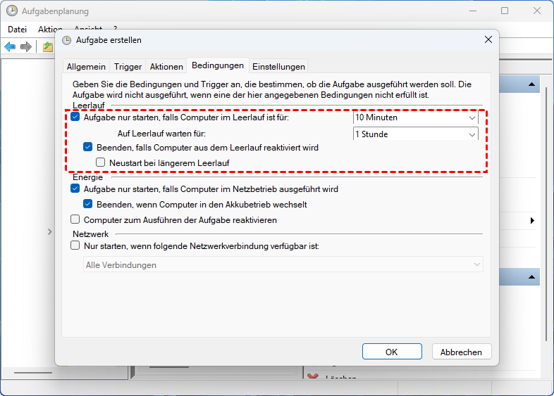 Schritt 6. Gehen Sie zum Tab „Bedingungen“. Aktivieren Sie „Aufgabe nur starten, falls Computer im Leerlauf ist für“ und „Beenden, falls Computer aus dem Leerlauf reaktiviert wird“.