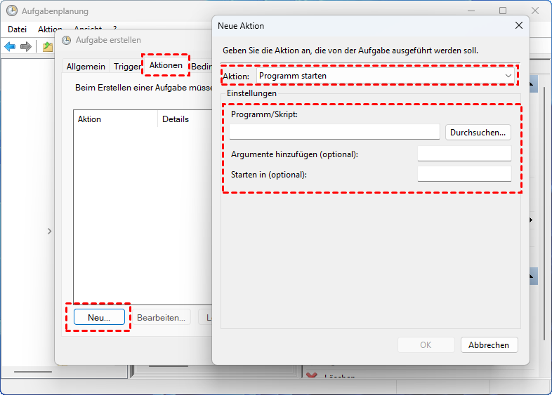 Schritt 5. Gehen Sie zum Tab „Aktionen“ und klicken Sie auf „Neu“. Wählen Sie „Programm starten“. Geben Sie als Programm „defrag“ ein. Als Argumente geben Sie„C: /O“ ein (für Laufwerk C: optimieren).