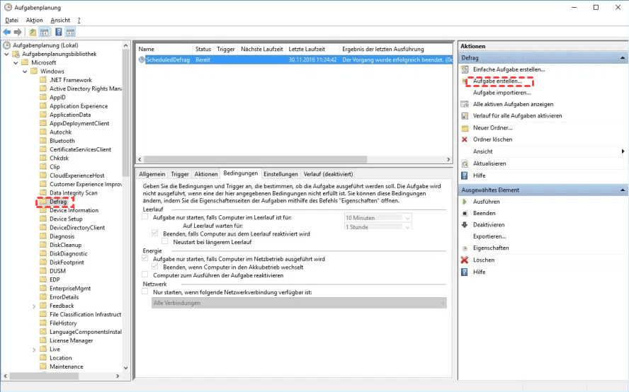 Schritt 2. Navigieren Sie zu: Aufgabenplanungsbibliothek > Microsoft > Windows > Defrag. Klicken Sie auf „Aufgabe erstellen“.