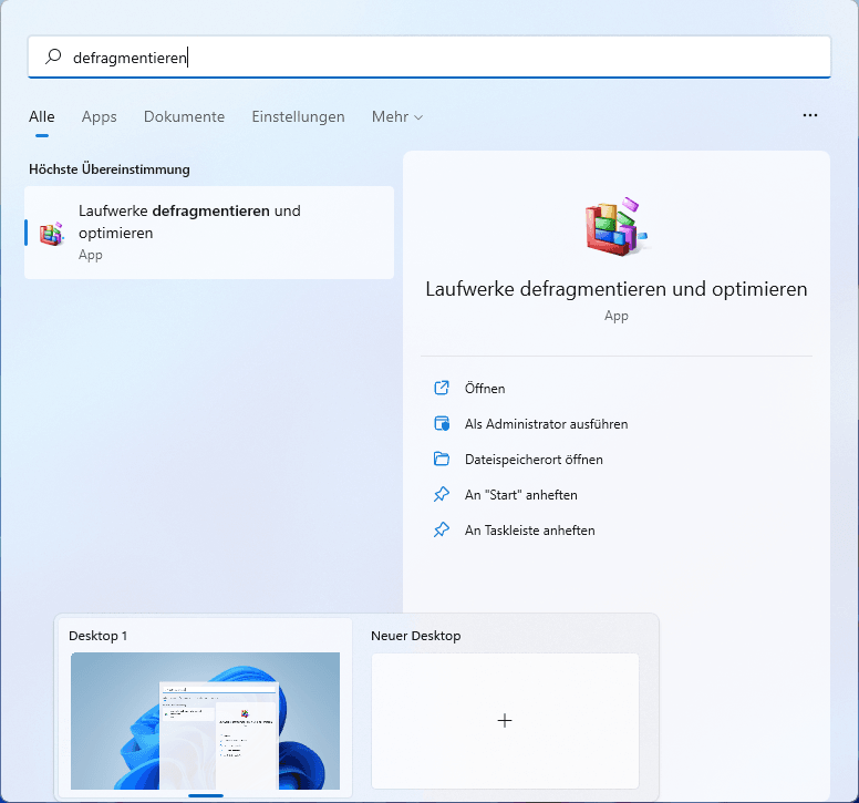 Schritt 1. Geben Sie „Defragmentieren“ in die Windows-Suche ein. Klicken Sie auf „Laufwerke defragmentieren und optimieren“.