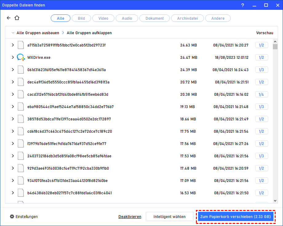 | Smart-Wahl | Wählt automatisch die zu löschenden Duplikate aus – schützt wichtige Dateien. |