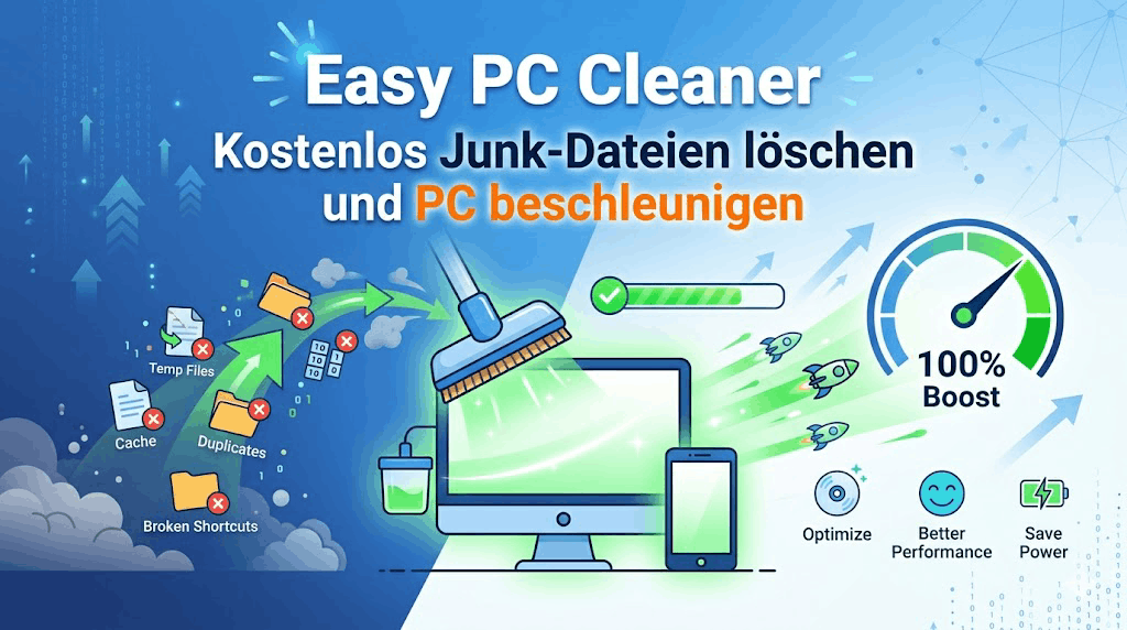 Ein Easy PC Cleaner ist die ideale Lösung, wenn Ihr Computer durch unnötige Dateien langsamer wird. In diesem Artikel erfahren Sie, warum eine regelmäßige Reinigung wichtig ist und wie Sie mit einem leistungsstarken Tool Junk-Dateien entfernen und große Dateien gezielt löschen können, um die Systemleistung deutlich zu verbessern.