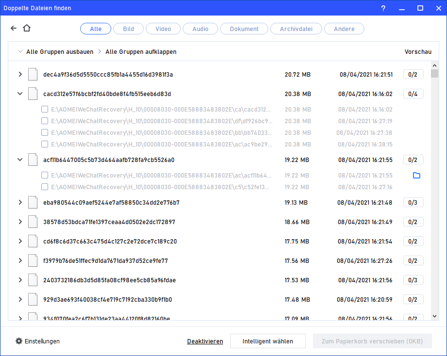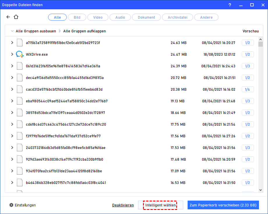 Klicken Sie auf „Intelligent wählen“, um automatisch unnötige Duplikate auszuwählen. Die Software wählt intelligent die zu löschenden Dateien aus – wichtige Dateien werden geschont.