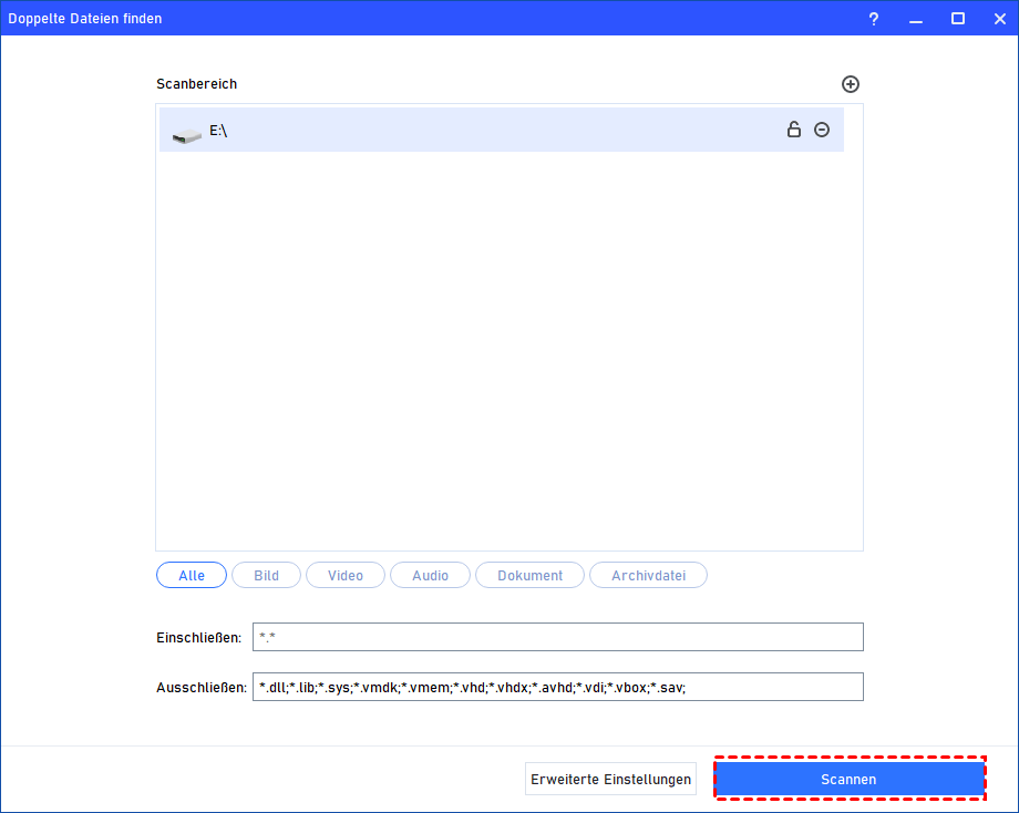 Legen Sie fest, welche Laufwerke oder Ordner durchsucht werden sollen. Bestimmen Sie, welche Dateitypen gescannt werden (z. B. Bilder, Videos, Dokumente). Klicken Sie auf „Scannen“.