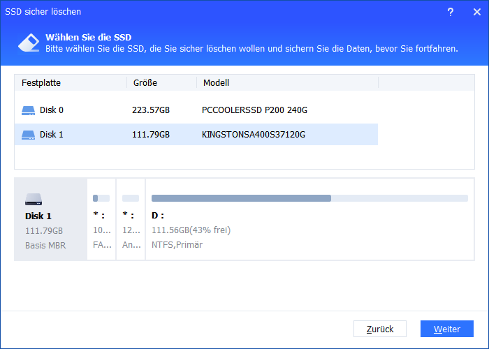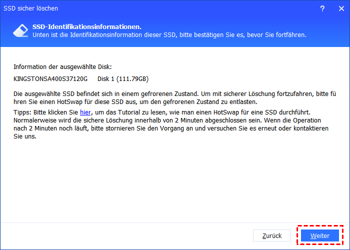 Wählen Sie die SSD aus, die Sie löschen möchten. Klicken Sie auf „Weiter“.