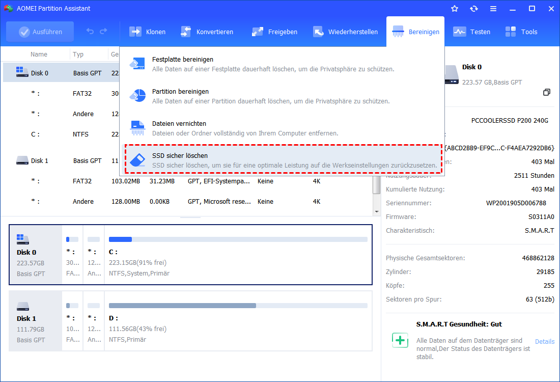 Das herkömmliche Überschreiben (wie bei HDDs) funktioniert bei SSDs aufgrund ihrer einzigartigen Lese- und Schreibmechanismen nicht optimal. Die AOMEI Partitionssoftware bietet daher eine spezielle Funktion „SSD sicher löschen“.