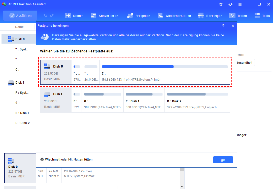 Die AOMEI Partitionssoftware ist das ideale Festplatte-Reinigen-Programm für Windows 11, 10, 8, 8.1 und 7. Mit der Funktion „Festplatte bereinigen“ können Sie alle Daten sicher und unwiderruflich löschen.