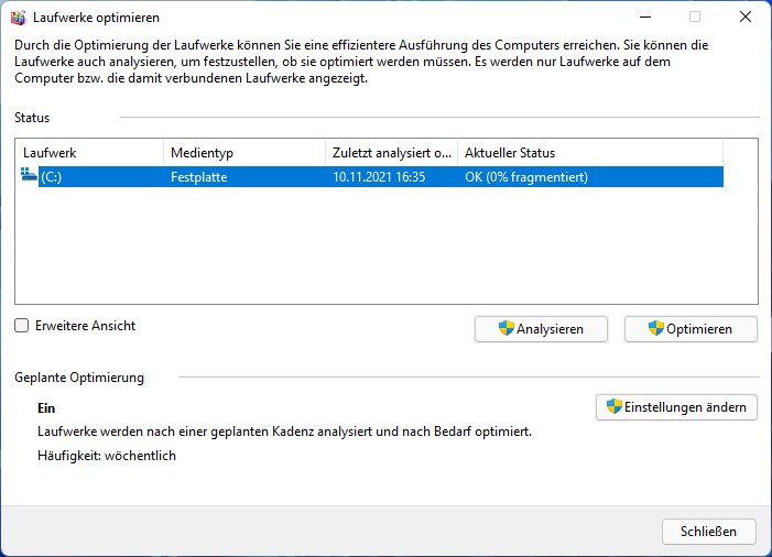 Wählen Sie das Laufwerk aus, das Sie defragmentieren möchten. In der Spalte „Aktueller Status“ sehen Sie den Fragmentierungsgrad.