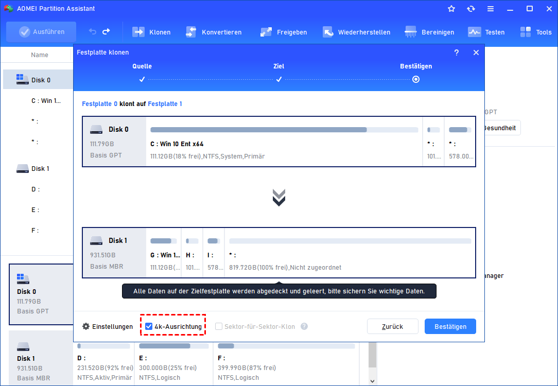 Vorschau des Partitionslayouts nach der Bearbeitung der Partitionsgröße. Wenn es sich um eine SSD handelt, die Sie klonen, aktivieren Sie die Option „4K-Ausrichtung“.