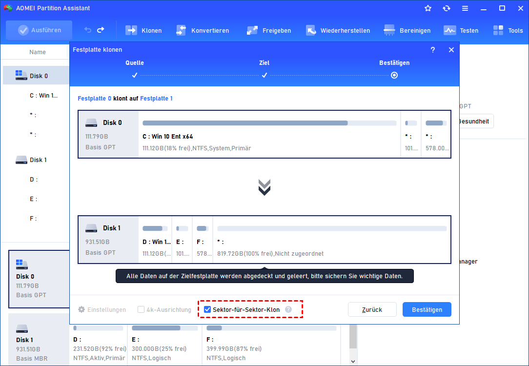Die einzelnen Schritte sind fast identisch mit Methode 1; Sie müssen lediglich das Kontrollkästchen „Sektor-für-Sektor-Klon“ auf dem Bestätigungsbildschirm aktivieren.
