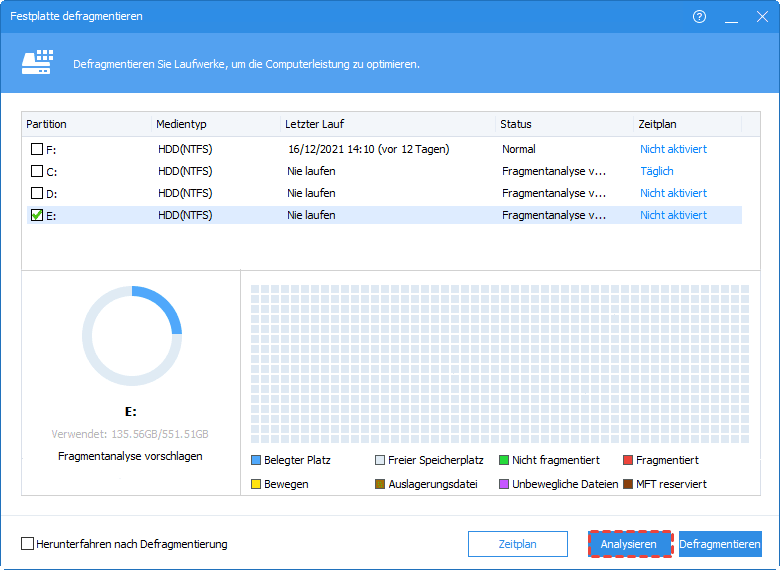 Tipp: Sie können unter „Zeitplan“ eine automatische Defragmentierung einrichten – täglich, wöchentlich oder monatlich.