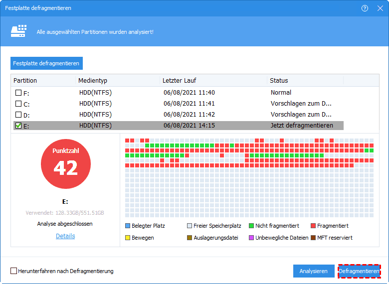 | Jetzt defragmentieren | < 60 | Defragmentierung dringend empfohlen |