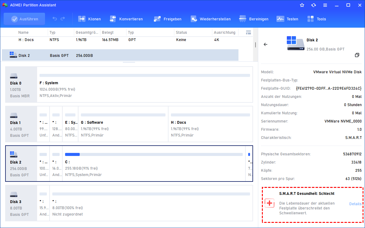 Bevor Sie mit der Optimierung beginnen, sollten Sie den Zustand Ihrer Festplatte kennen. Die AOMEI Partitionssoftware unterstützt S.M.A.R.T. (Self-Monitoring Analysis and Reporting Technology) – das Tool erledigt die Analyse für Sie mit wenigen Klicks.
