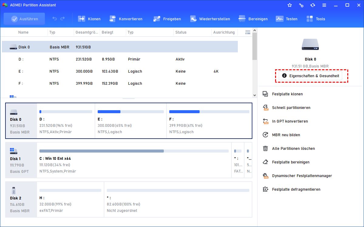 Schritt 2: Klicken Sie auf die gewünschte Festplatte und wählen Sie „Eigenschaften & Gesundheit“.