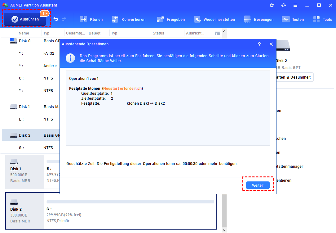 Schritt 6. Klicken Sie auf „Ausführen“ und „Weiter“, um die Festplatte auf SSD zu klonen, nachdem Sie zur Hauptschnittstelle zurückgekehrt sind.