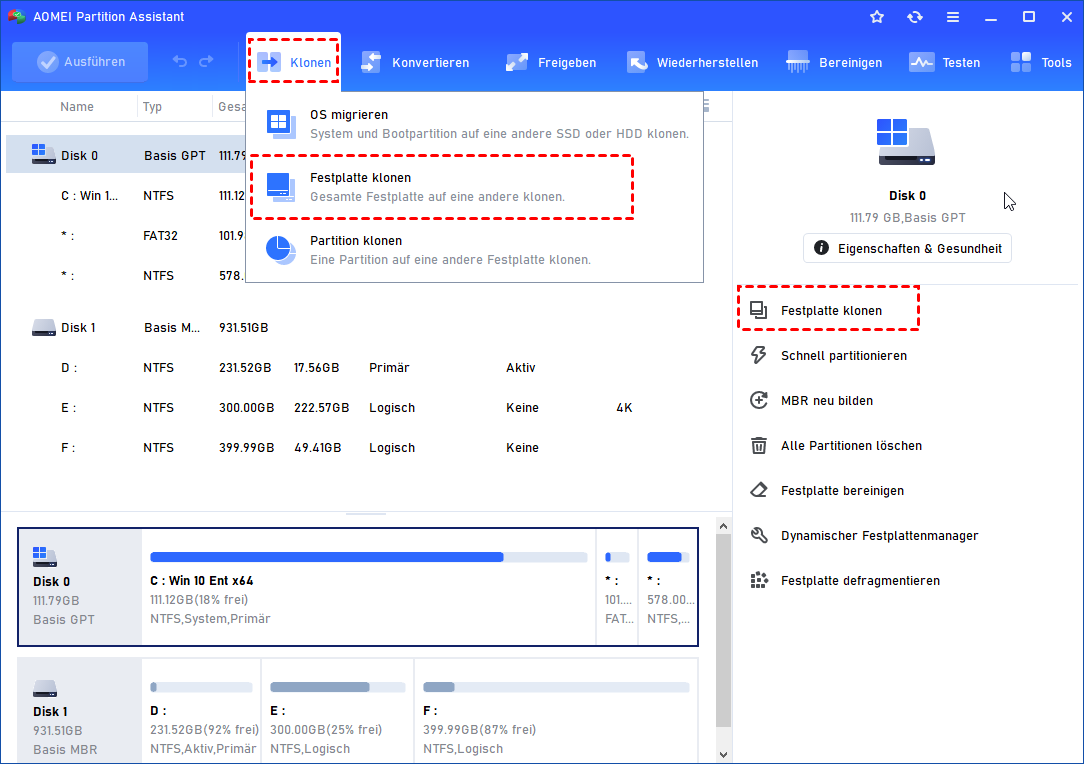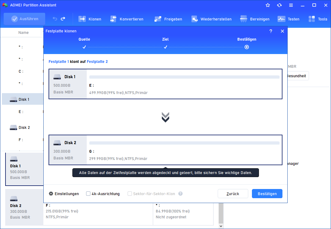AOMEIPartitionssoftware bietet zwei unterschiedliche Methoden zum Klonen von HDD auf SSD. Je nach Ihren Anforderungen können Sie die passende wählen: