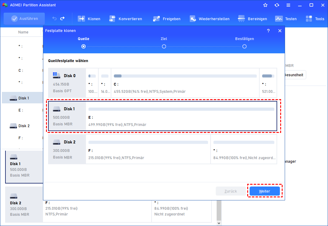 Schritt 2. Wählen Sie die alte HDD als Quellfestplatte und klicken Sie auf „Weiter“.