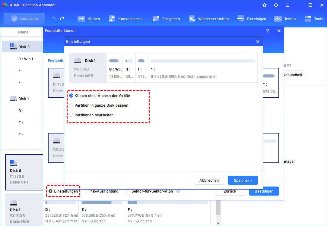 Schritt 4. Klicken Sie auf „Einstellungen“. Hier können Sie die Partitionsgröße auf der Zielfestplatte anpassen. Wenn Sie die HDD auf eine kleinere SSD klonen, stehen nur zwei letzte Optionen zur Verfügung. Wählen Sie eine aus und klicken Sie auf „Speichern“.