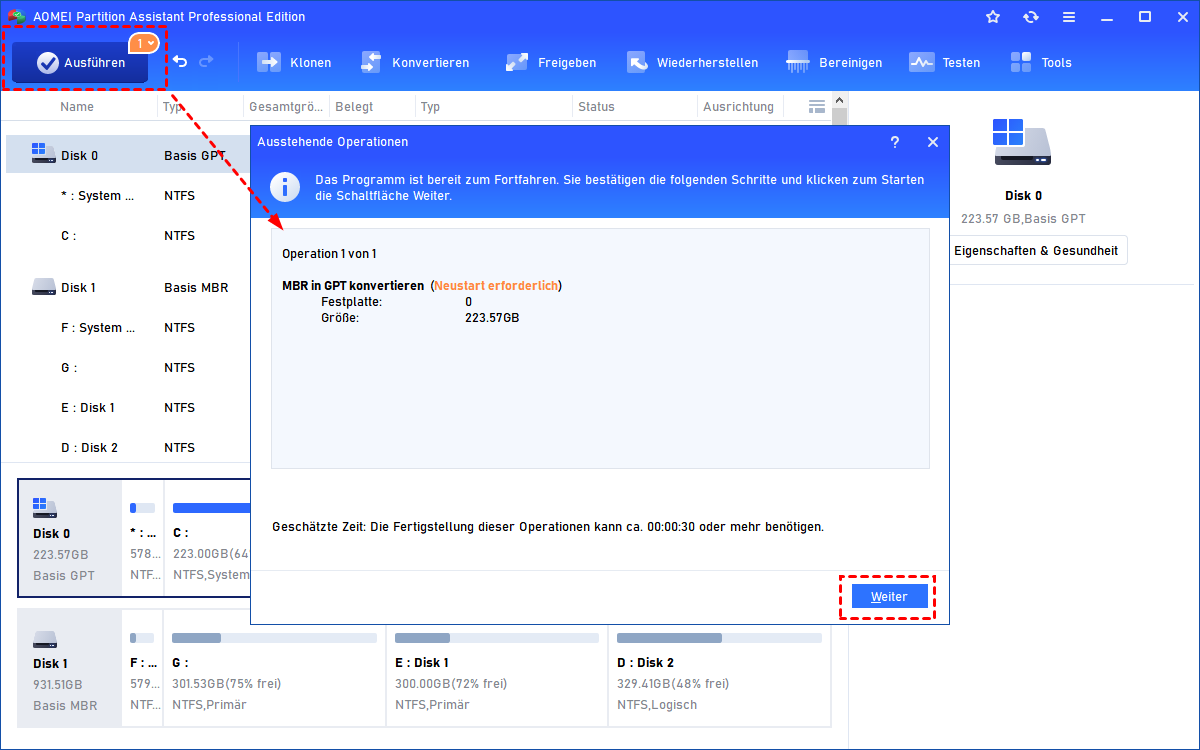 Schritt 5. Warten Sie ein paar Minuten, bis Sie das Fenster mit dem Title „Glückwunsch“ sehen. Das bedeutet, dass Ihre Festplatte von MBR in GPT erfolgreich umgewandelt wurde.