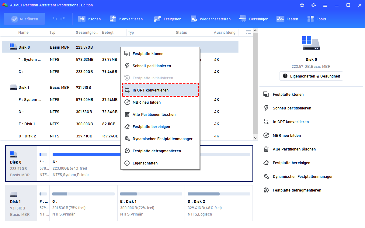 Gibt es eine bessere Lösung, mit der man MBR zu GPT ohne Bereinigen des Datenträgers einfach konvertieren kann? Die Antwort ist postiv. Hier empfehlen wir Ihnen eine All-in-1 leistungsfähige Partitionssoftware - AOMEI Partitionssoftware. Sie können mit diese Partitionssoftware Ihre Festplatten oder Partitionen gut verwalten, wie z.B, Windows 10 Partitionen zusammenführen, Partition verkleinern oder vergrößern, Festplatte partitionieren usw.