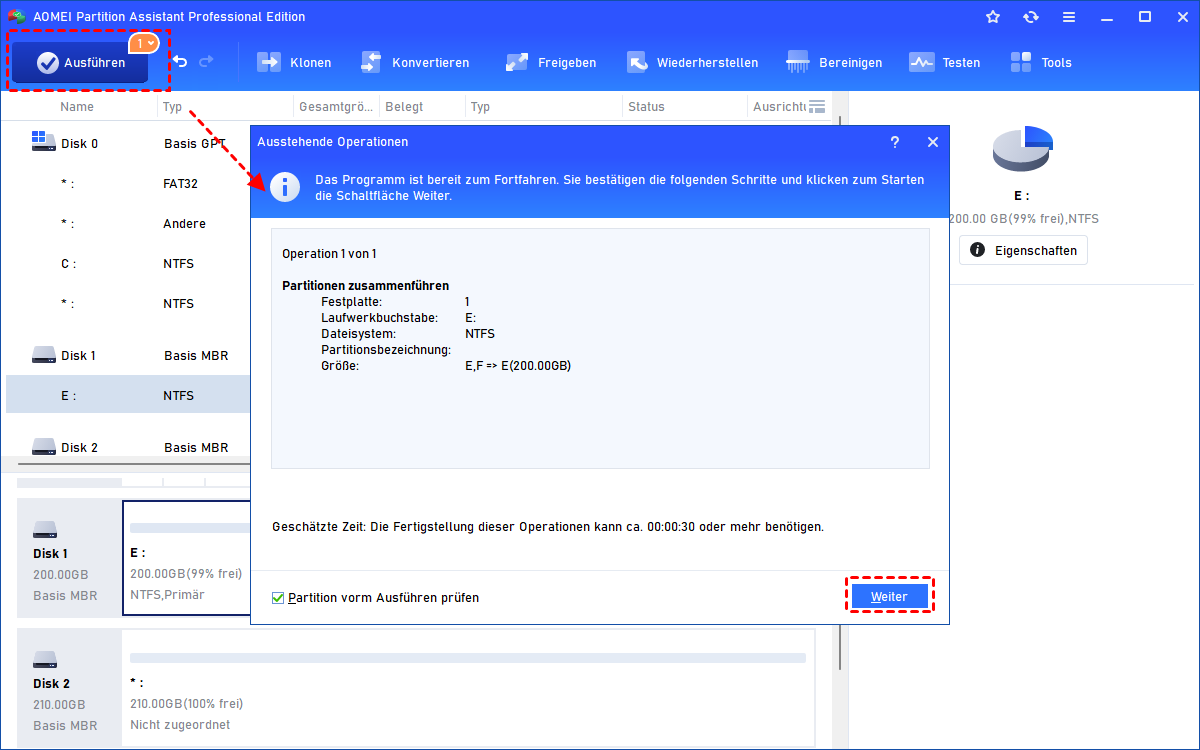 Schritt 3. Führen Sie durch Klick auf „Ausführen“ und „Weiter“ in der Symbolleiste ausstehende Operationen aus.