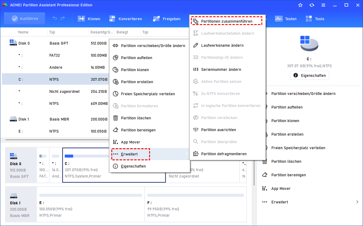 Schritt 1. Laden Sie die Software herunter und installieren Sie sie. Klicken Sie mit der rechten Maustaste auf die Partition, die Sie vergrößern möchten (in unserem Beispiel C:). Wählen Sie im Kontextmenü „Erweitert“ ⇨ „Partitionen zusammenführen“.