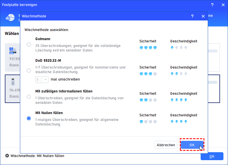 Da SSDs eine andere Technologie als HDDs verwenden, kann das Überschreiben mit Nullen weniger effektiv sein. Für SSDs empfiehlt sich die „SSD sicher löschen“-Funktion.