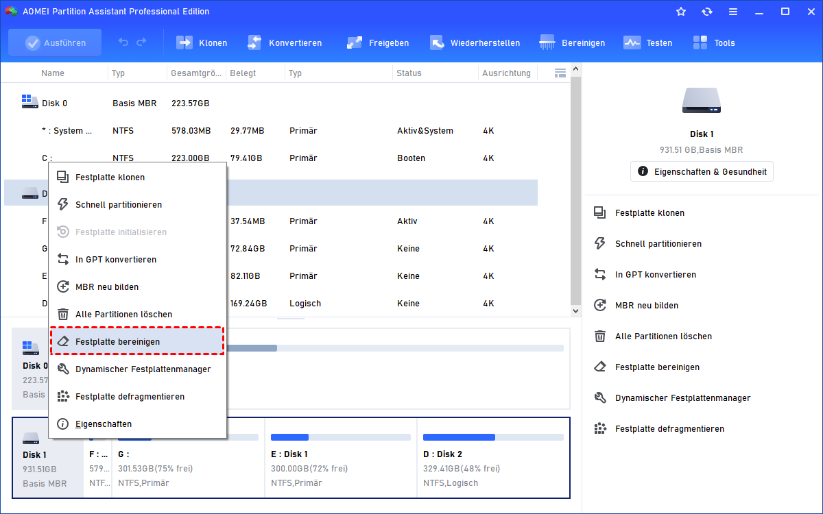 Wenn Sie Ihren Computer verkaufen oder verschenken möchten, reicht ein normales Löschen nicht aus. Gelöschte Dateien können oft mit speziellen Tools wiederhergestellt werden. Mit der „Festplatte bereinigen“-Funktion der AOMEI Partitionssoftware können Sie die Daten vollständig und unwiderruflich löschen.