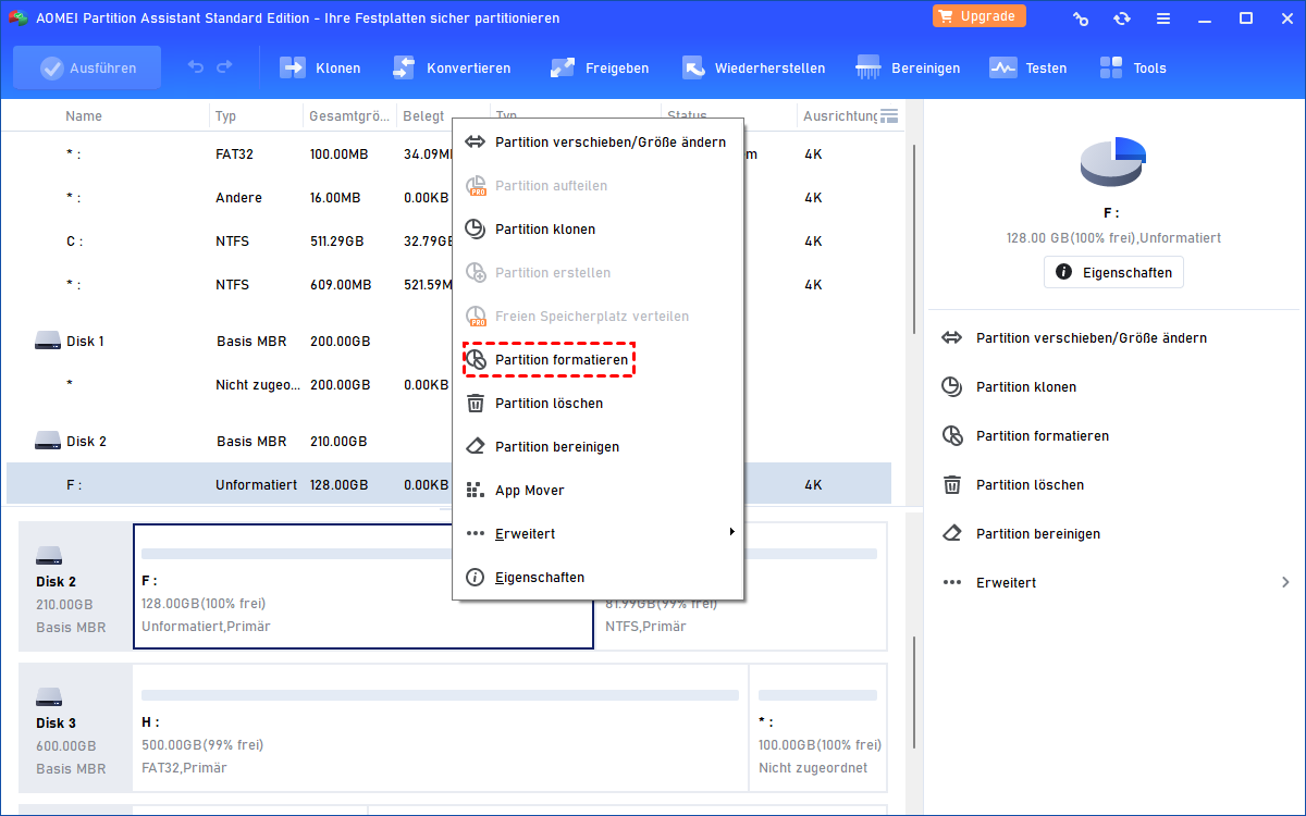 Hier zeigen wir Ihnen die detaillierten Schritte, wie man SD-Karte RAW in FAT32 oder NTFS formatieren kann: