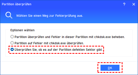 Schritt 3. Im Popup-Fenster können Sie drei Wege zum Überprüfen der Fehler sehen. Wählen Sie einfach die letzte „Überprüfen Sie, ob es auf der Partition defekten Sektor gibt". Klicken Sie auf „OK“, um weiterzugehen.