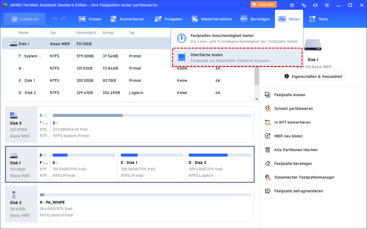 Wenn es viele Partitionen auf Ihre SSD gibt und Sie nicht sicher sind, welche Partition beschädigt ist, können Sie dann „Oberfläche testen“ aus dem Menü „Testen“ wählen.