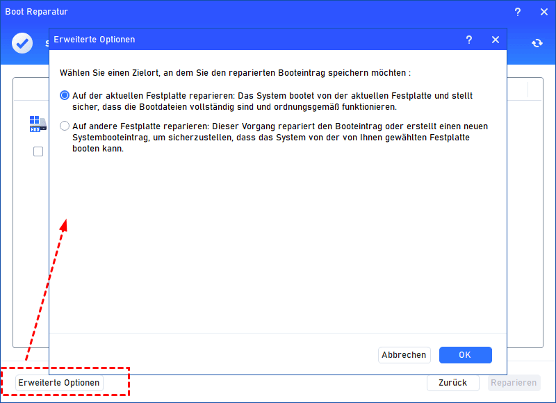 „Auf der aktuellen Festplatte reparieren“ (Standard) – repariert den Boot-Eintrag auf der aktuellen Festplatte.