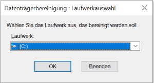 Wählen Sie das Laufwerk aus, das Sie bereinigen möchten (meist C:). Klicken Sie auf „OK“.