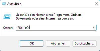 Drücken Sie die Tasten „Windows + R“. Geben Sie „%temp%“ ein und drücken Sie Enter.