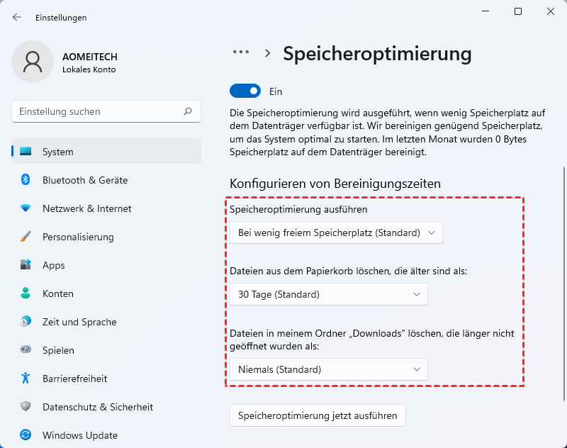 Klicken Sie auf „Speicheroptimierung konfigurieren oder jetzt ausführen“, um die Einstellungen anzupassen. Legen Sie fest, wie oft die automatische Bereinigung durchgeführt werden soll (täglich, wöchentlich, monatlich).