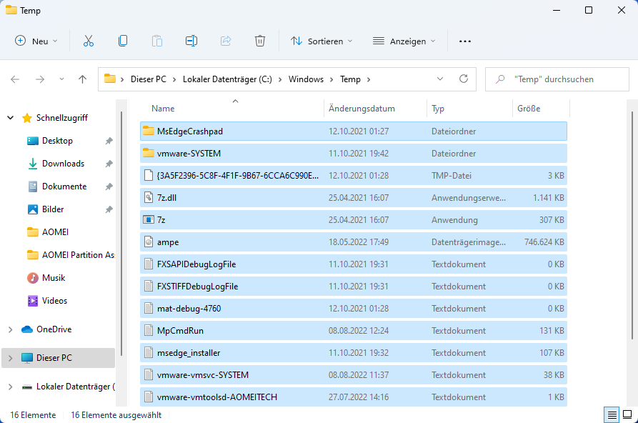 Der Temp-Ordner öffnet sich. Drücken Sie „Ctrl + A“, um alle Dateien auszuwählen. Drücken Sie DEL (Löschen). Bestätigen Sie die Löschung.