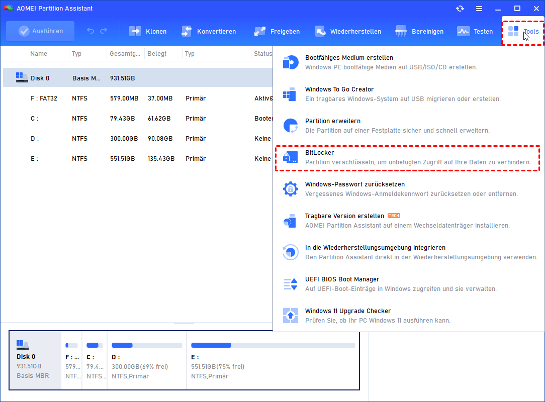 Schritt 1. Installieren und starten Sie AOMEI Partitionssoftware. Klicken Sie auf die Registerkarte „Tools“ und wählen Sie „BitLocker“.