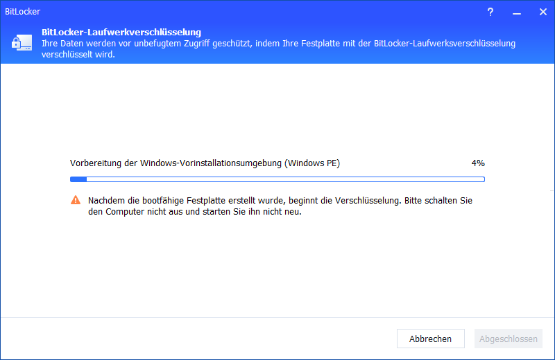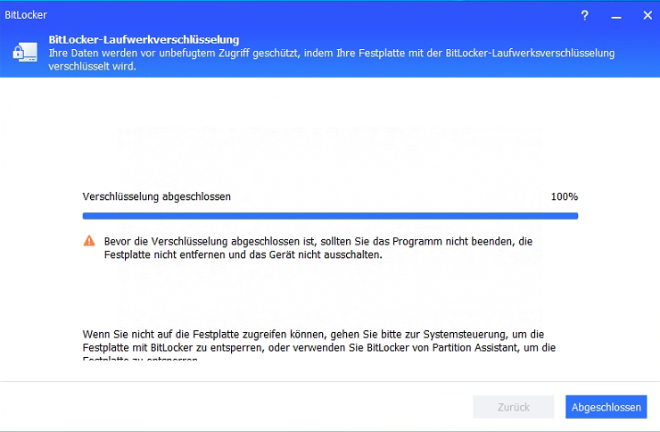 Schritt 6. Der Verschlüsselungsvorgang kann je nach Größe des Laufwerks mehrere Stunden dauern. Schalten Sie den PC während dieser Zeit nicht aus, trennen Sie keine Kabel und unterbrechen Sie den Vorgang nicht! Nach erfolgreichem Abschluss erscheint die Meldung „Verschlüsselung abgeschlossen“.