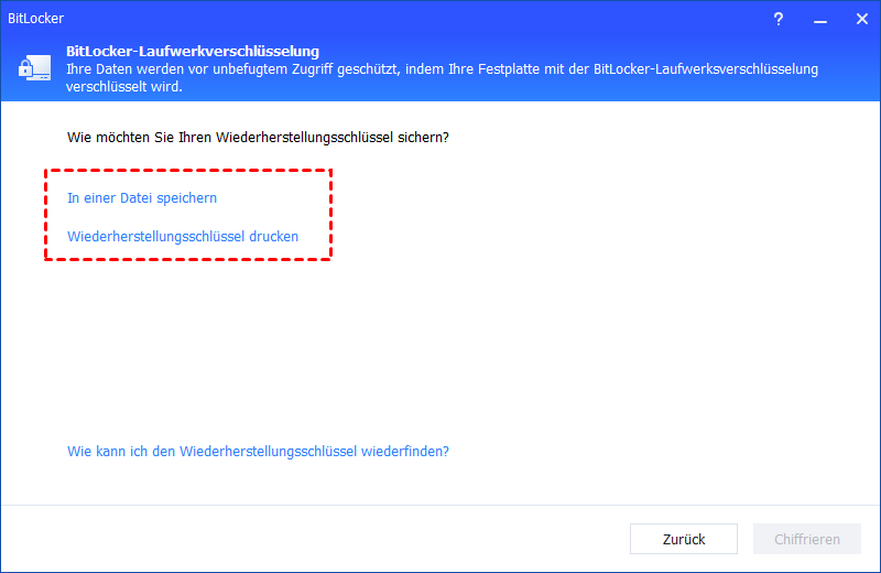 Schritt 4. Wählen Sie eine Methode zum Sichern Ihres Wiederherstellungsschlüssels. Sie können entweder „In einer Datei speichern“ oder „Wiederherstellungsschlüssel drucken“ auswählen.