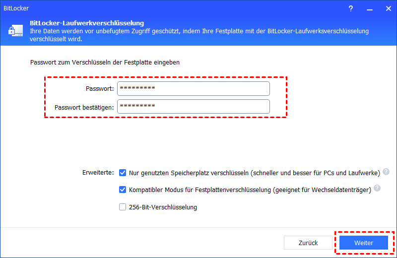 Schritt 3. Legen Sie ein Passwort zum Verschlüsseln des Laufwerks fest, bestätigen Sie es und klicken Sie auf „Weiter“.