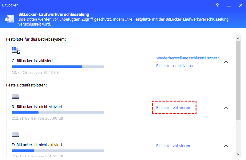 Schritt 2. Alle Laufwerke im System werden angezeigt, einschließlich Betriebssystemlaufwerken, festen Datenlaufwerken und Wechseldatenträgern. Suchen Sie die Systempartition, die Sie mit BitLocker verschlüsseln möchten, und klicken Sie auf die Option „BitLocker aktivieren“. (Hier nehmen wir das Laufwerk D: als Beispiel.)