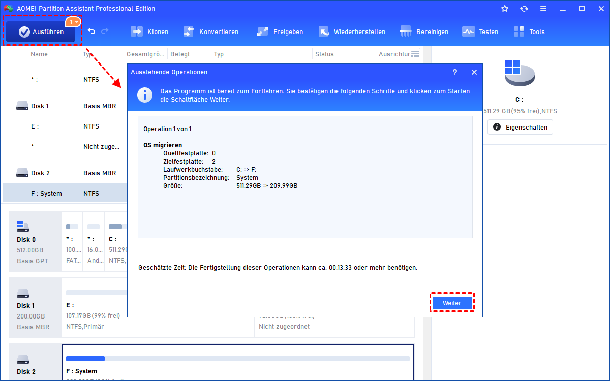 Schritt 5. Klicken Sie auf „Ausführen“ und dann auf „Weiter“, um den ausstehenden Vorgang auszuführen.
