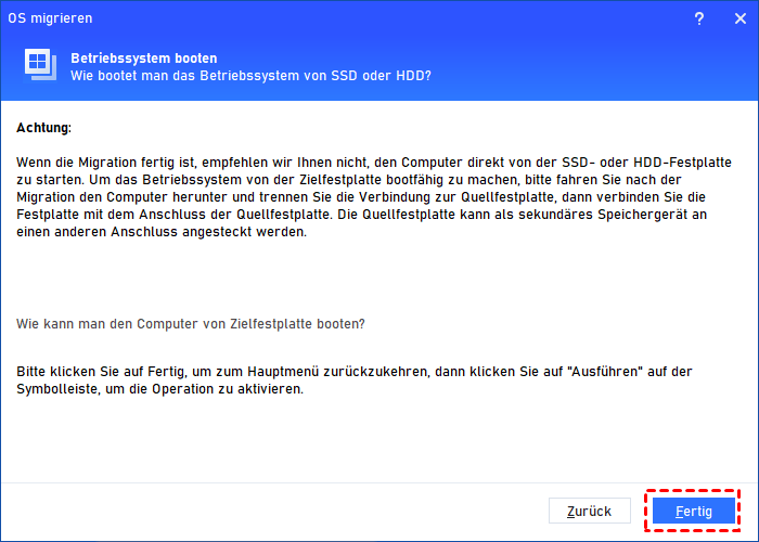 Schritt 4. Es gibt einen „Hinweis“ zum Booten des Betriebssystems nach der Migration des Windows-Systems.