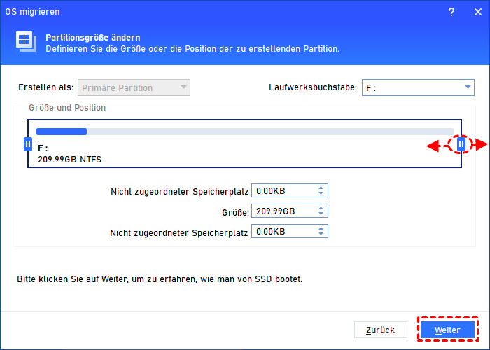 Schritt 3. Ziehen Sie im neuen Fenster den Doppelpfeil, um die Größe der Systempartition festzulegen.