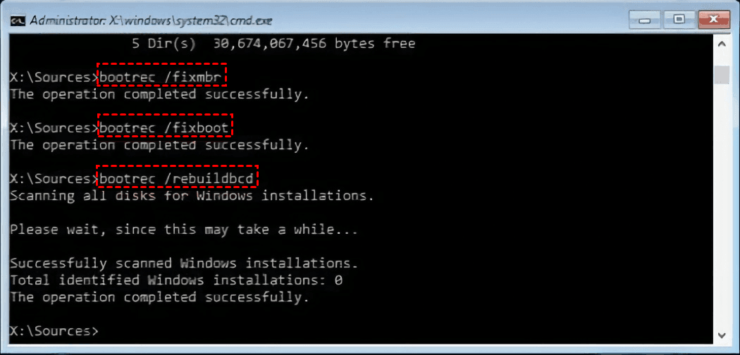 - Führen Sie die Befehle bootrec /fixmbr und bootrec /fixboot aus.