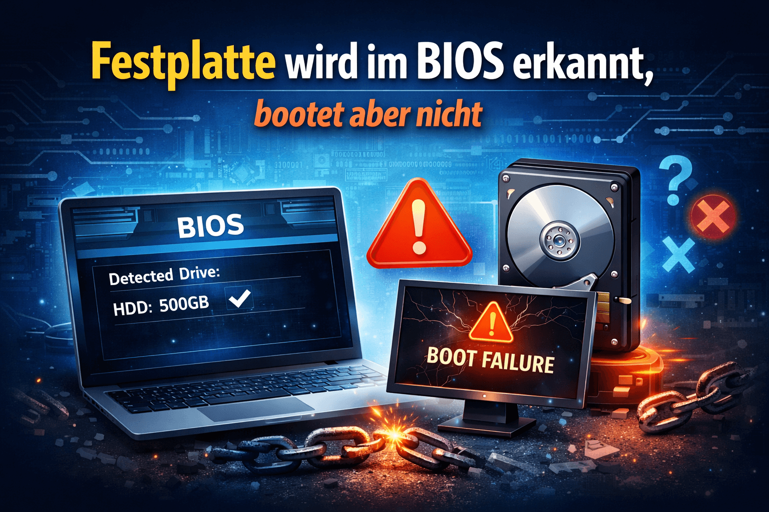 Wenn die Festplatte im BIOS erkannt wird, aber nicht bootet, liegt das Problem fast nie an der Hardware selbst. In den meisten Fällen sind falsche BIOS-Einstellungen, beschädigte Bootdateien, inkompatible Boot-Modi oder fehlerhafte Klonprozesse verantwortlich. Mit systematischer Diagnose und den richtigen Reparaturschritten lässt sich das Problem in der Regel vollständig beheben – ohne Neuinstallation und ohne Datenverlust.