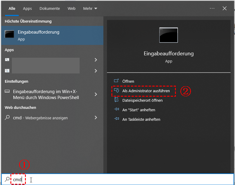 Schritt 1. Klicken Sie auf Win + R, dann geben Sie „cmd“ → Rechtsklick → Als Administrator ausführen.