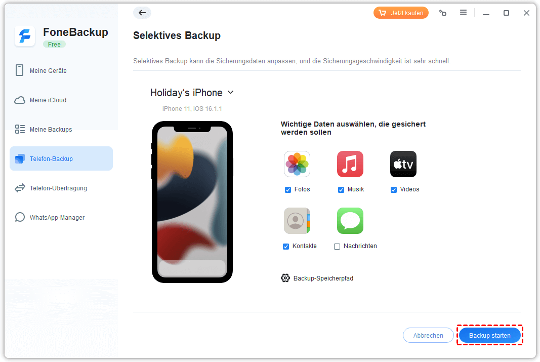 - Wählen Sie einen Backup-Speicherpfad aus > Klicken Sie auf Backup starten.
